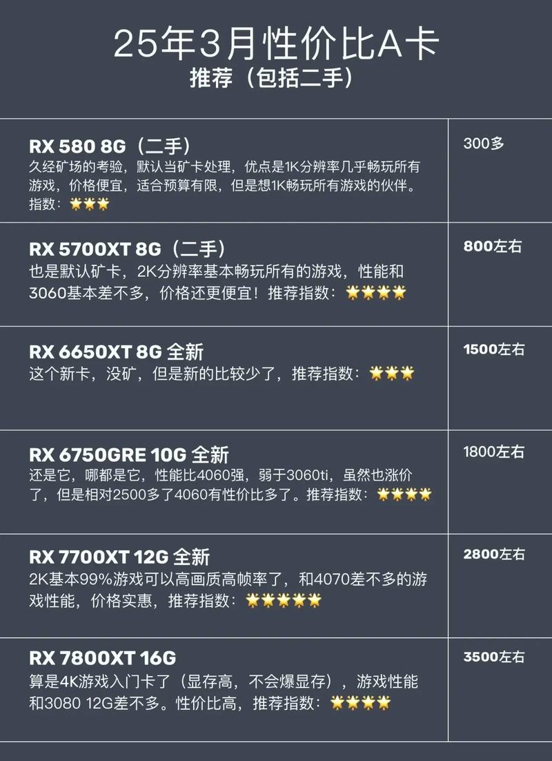 - AMD Radeon RX 78:适合中端游戏和图形处理需求。