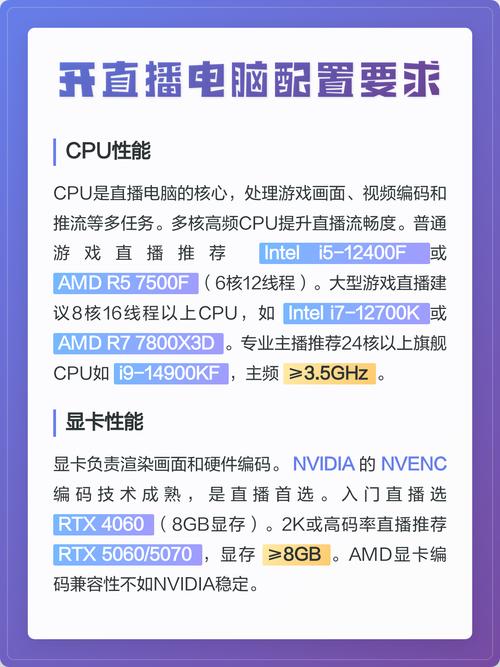 - 选择性能强劲的显卡,确保能够支持直播效果。