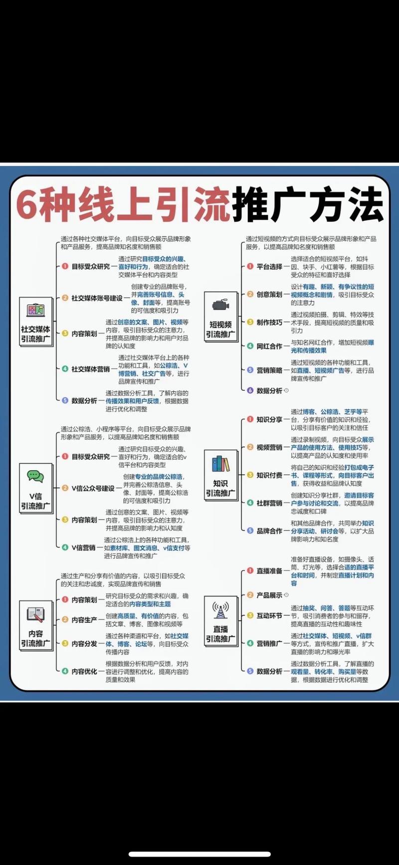 - 关键词优化:使用百度、Google等搜索引擎,优化关键词,提高搜索结果排名,营销**:制作高质量文章、视频或视频讲解,利用搜索引擎索引,扩大曝光。