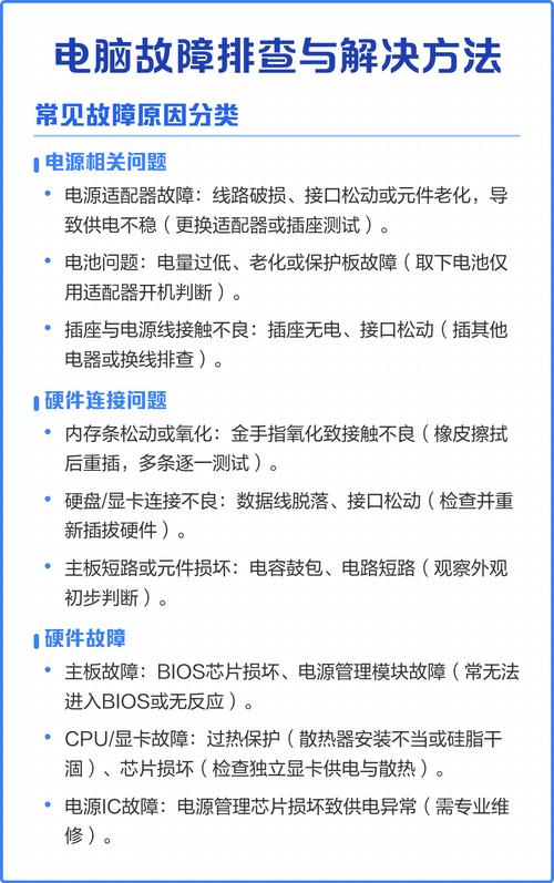 手提电脑作为现代家庭生活中不可或缺的设备之一,其故障率相对较高,常见的故障包括电源问题、显卡连接不畅、电源管理不足等,如果不能及时发现和解决这些故障,可能导致电脑运行不稳定、功能受限甚至无法使用,故障排查是解决这些问题的关键。
